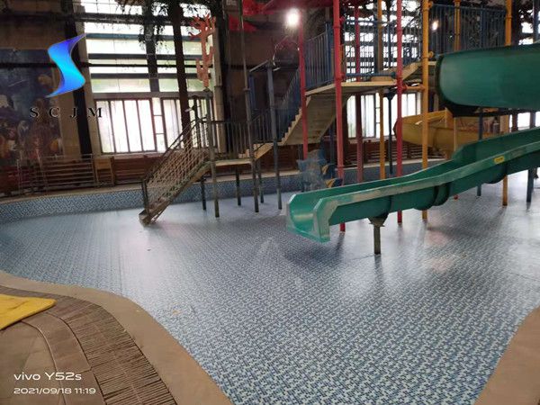 本項(xiàng)目位于北京市,為室內(nèi)水上樂園項(xiàng)目,原基礎(chǔ)為馬賽克瓷磚,局部有脫落、開裂問題,采用1.5mm泳池膠膜施工安裝,采用滿刮膠工藝熱熔焊接。施工安裝之前瓷磚損壞部分做找平處理,泳池膠膜施工安裝完畢后,整體比較平整、美觀。現(xiàn)場效果如下: